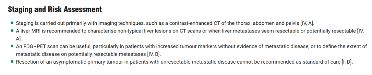 • برداشت جراحی تومور اولیه بدون علامت در بیمارانی که دارای بیماری متاستاتیک غیرقابل برداشت هستند، به‌عنوان استاندارد مراقبت توصیه نمی‌شود. (I, D)